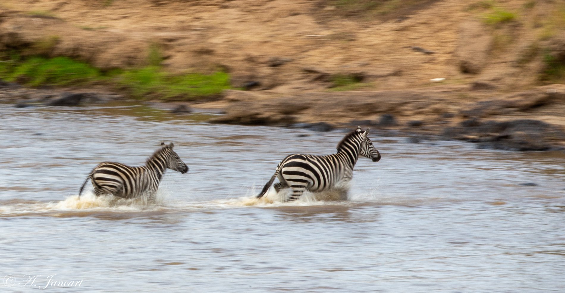 Les zèbres voulant traverser la Mara sont nombreux. Mais le danger est tout proche. Les crocodiles sont partout. Ce zèbre semble en mauvaise posture. Il s'est fait attraper par la peau et fait connaître son désaccord au croco qui est obligé de lâcher prise. Le zèbre en profite et arrivera sur la rive sans encombres. Une autre attaque se produit dans la foulée. En changeant subitement de direction, cet individu s'en sort également. Mais les jeunes sont plus vulnérables et celui-ci se fait emporter vers des eaux plus profondes. Un deuxième crocodile lui donnera le coup de grâce. endant ce temps, le reste de la troupe se dépêche de rejoindre la rive sans se retourner sur le malheureux qui s'est fait prendre. Quelques zèbres traversent la Mara. On pourrait croire qu'en arrivant sur la rive, le calme règne mais ... les altercations sont monnaie courante chez les zèbres. Ceci n'est pas un câlin, mais une âpre discussion. Dès qu'un des protagoniste prend le dessus, l'autre riposte immédiatement. Cela ce termine souvent par la fuite d'un des adversaire. Mais le calme revient très vite devant la rivière.